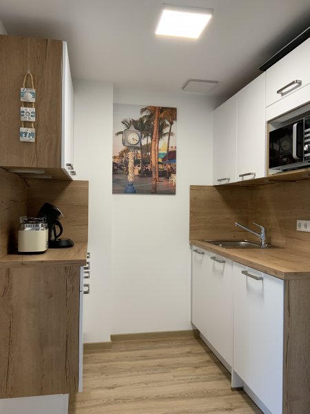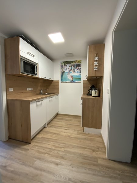 Die Küchenzeile beinhaltet einen Kühlschrank, Geschirrspüler, Mikrowelle, 2 Platten Induktionsherd, Kaffee-Pad Maschine, Wasserkocher, Toaster, Koch-, Ess- und Kaffeegeschirr.