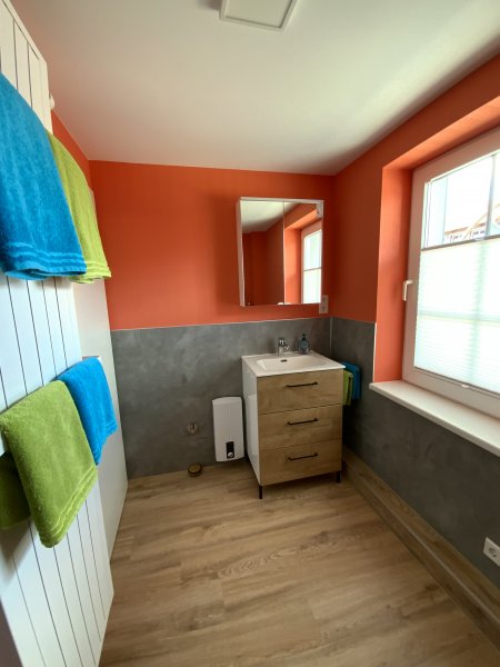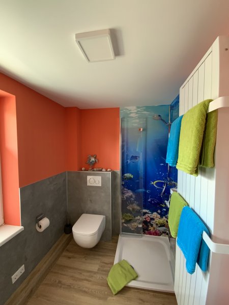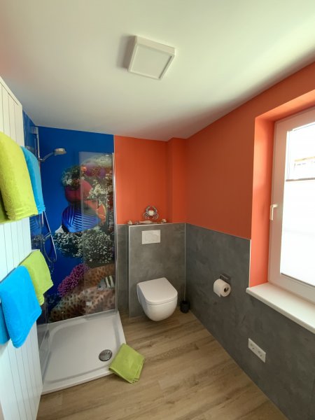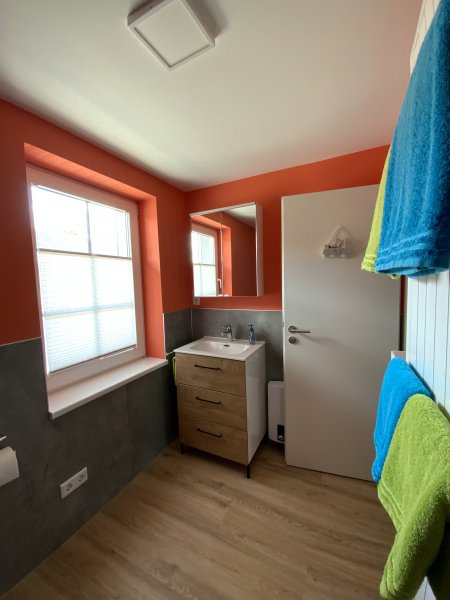 Bad mit Dusche, WC und Waschtisch. Fön ist vorhanden.