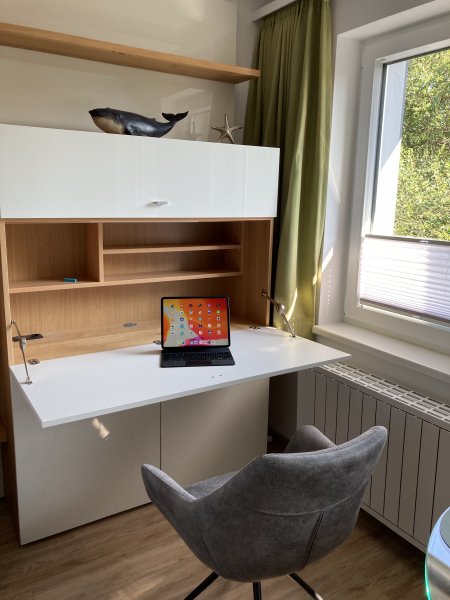 Die Küchenzeile beinhaltet einen Kühlschrank, Geschirrspüler, Mikrowelle, 2 Platten Induktionsherd, Kaffee-Pad Maschine, Wasserkocher, Toaster, Koch-, Ess- und Kaffeegeschirr.